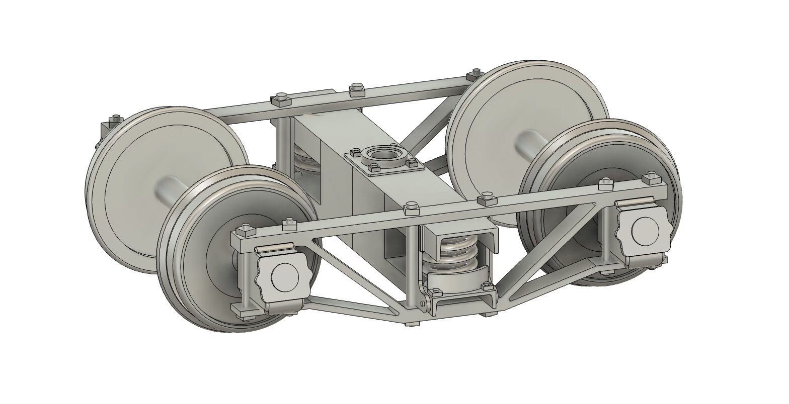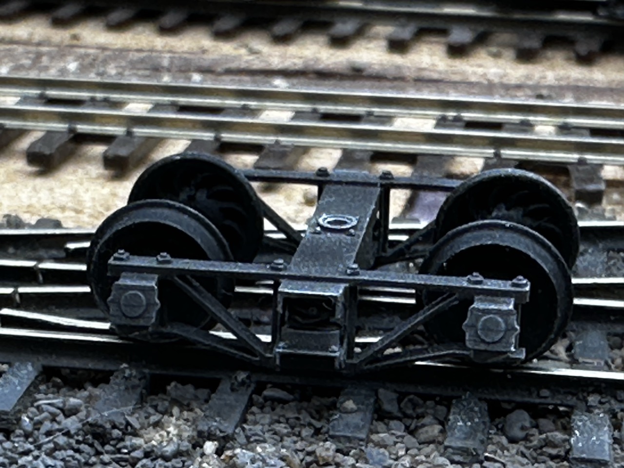 Sn2 (S scale on Hon3 track representing 2 foot narrow gauge in S scale 1/64) trucks representing late archbar trucks used on the Sandy River & Rangeley Lakes Railroad in Maine. 3D Printed and designed to use Kadee #718 HOn3 wheels. One pair of trucks (two trucks).